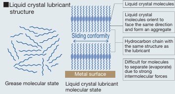 A liquid crystal olyan rendezett láncot képez, amelyben a molekulák egy irányba orientálódnak és aggregátumot alkotnak. Ez a szerkezet biztosítja a tartós kenőfilm kialakulását, amely: