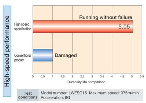 A tesztkörülmények között (LWESG15 modell, 375 m/min sebesség, 6 G gyorsulás) az IKO High-speed típus 5,05-szörös ideig működött meghibásodás nélkül, miközben a hagyományos termékek már károsodást mutattak.